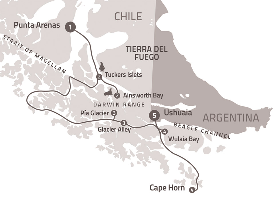 Check in at 1398 Costanera del Estrecho Ave. (Arturo Prat Port) in Punta Arenas between 13:00 and 17:00 (1-5 PM) on the day of your Australis cruise departure. Board the vessel at 6 PM. After a welcoming toast and introduction of captain and crew, the ship departs for one of the remotest corners of planet Earth. During the night we cross the Strait of Magellan and enter the labyrinth of channels that define the southern extreme of Patagonian. The twinkling lights of Punta Arenas gradually fade into the distance as we enter the Whiteside Canal between Darwin Island and Isla Grande de Tierra del Fuego.