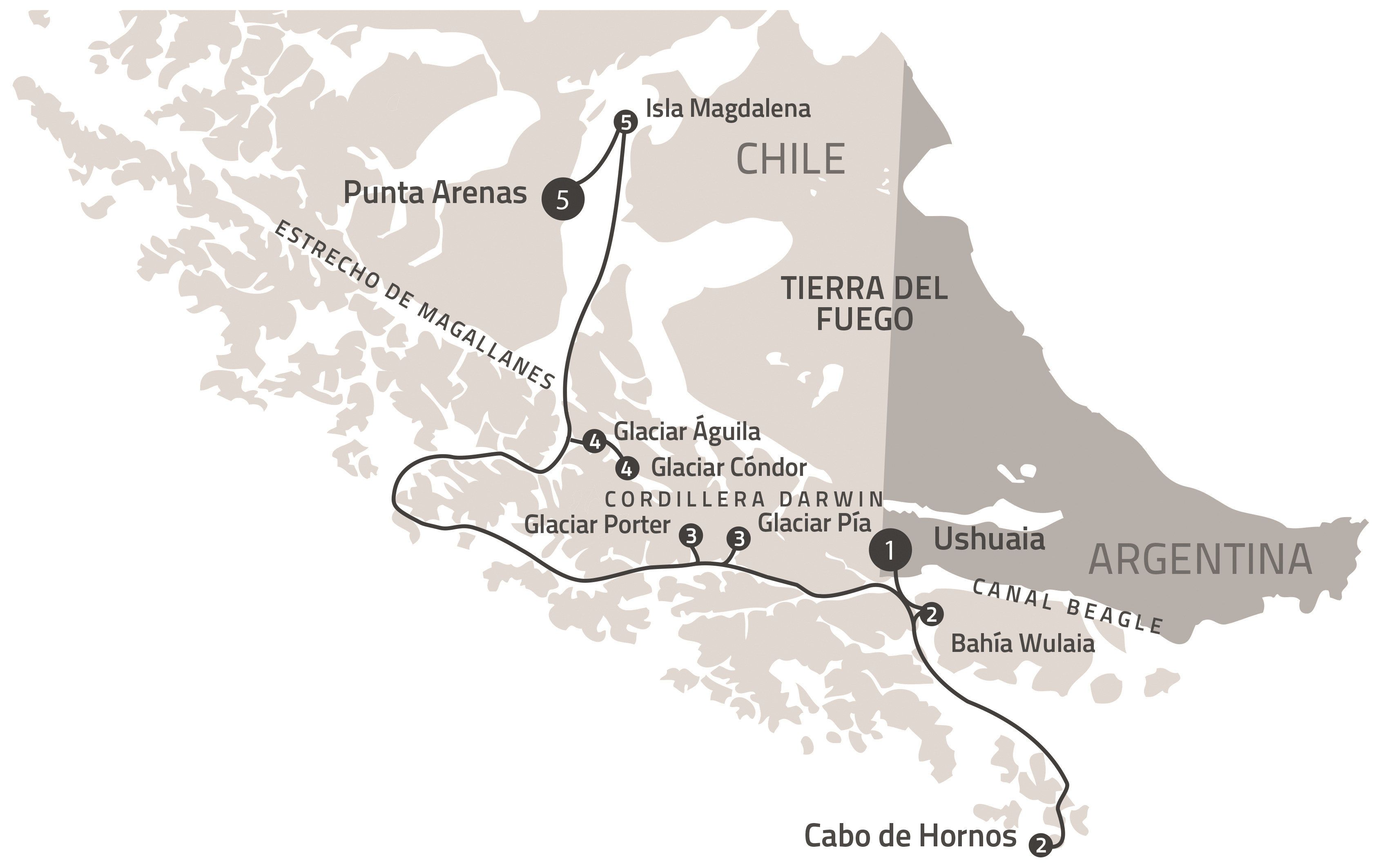 Embárcate en una aventurera de cinco días y cuatro noches que viaja desde Ushuaia (Argentina) hasta Punta Arenas (Chile), pasando por algunos de los lugares más remotos e increíbles del planeta. Descubre la belleza salvaje de la Patagonia en un viaje que te mostrará los prístinos paisajes de la región, su variada fauna y la fascinante historia humana a bordo de un barco de expedición que lleva extraordinarios niveles de comodidad y servicio hasta el fin del mundo. Al dejar atrás las titilantes luces de Ushuaia, la embarcación visita lugares legendarios como el Cabo de Hornos y la Bahía Wulaia para luego navegar hasta el Canal Beagle. Al continuar a través de un laberinto de islas visitaremos diversos glaciares, gigantes congelados que resguardan el extremo sur del Archipiélago de Tierra del Fuego y luego entraremos en el mítico Estrecho de Magallanes. La última parada es la Isla Magdalena, destacada por sus bulliciosas colonias de pingüinos, para posteriormente atracar en Punta Arenas