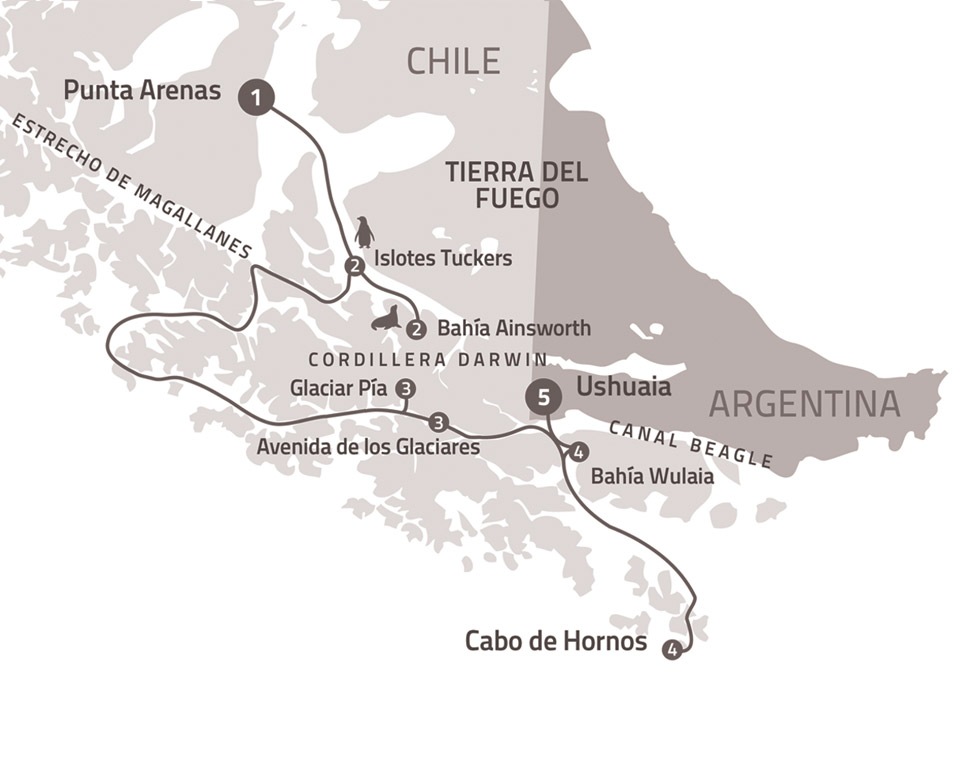 Como podrá ver a lo largo de este viaje de cuatro noches, los tramos al sur de Tierra del Fuego conforman una de las rutas de cruceros más mágicas de la Patagonia. Comenzará este tour en Punta Arenas, donde podrá instalarse en su cabina y empezar a familiarizarse con la vida a bordo, conocer a la tripulación y también disfrutar de una bebida en la cubierta, mientras zarpamos hacia el impresionante y desconocido horizonte de la Patagonia. Después llegaremos al Parque Nacional Alberto de Agostini y a la pintoresca bahía de Ainsworth, donde estará rodeado de montañas cubiertas de nieve y de una rica vida silvestre, y donde también podrá disfrutar de espectaculares senderos. De hecho, un asombroso paisaje se encuentra presente a lo largo de todo el crucero desde el Glaciar Alley hasta el Glaciar Pía, pasando por la cordillera de Darwin y por el canal de Beagle. Este asombroso itinerario incluye muchos de los puntos más destacados de Tierra del Fuego, además de desembarques en tierra, paseos, caminatas, excursiones en bote Zodiac y encuentros con la vida silvestre, y culmina con la Bahía de Wulaia, el Canal Murray y la visita al Parque Nacional Cabo de Hornos, lo que supone, sin lugar a dudas, un final espectacular.