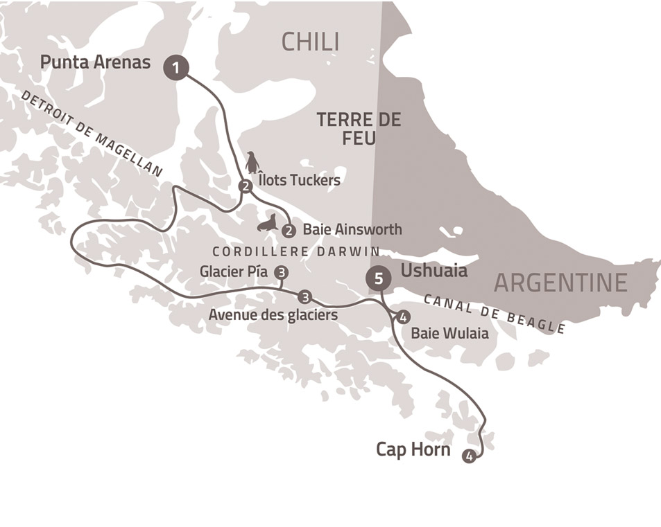 Explorez la route d’Ushuaia et venez découvrir la stupéfiante beauté naturelle de la Patagonie et de la Terre de Feu. Vous vivrez une grande aventure au bout du monde, et profiterez des meilleures prestations à bord d’un bateau conçu pour répondre au mieux à votre confort en compagnie de notre équipage et de nos guides experts. Leur mission, en plus de votre sécurité, est de vous assurer un voyage remarquable et inoubliable. Nos croisières en Patagonie vous offrent l’opportunité de vivre une expérience inoubliable au plus proche de la nature et de la faune sauvage, comme jamais vécue auparavant. Venez observer de plus près la faune locale telle que les manchots, les oiseaux marins et les loups de mer. Sentez la chaude étreinte des couchers de soleil de la Patagonie, observez les belles montagnes enneigées, naviguez depuis Punta Arenas, cabotez par le Cap-Horn et bien d’autres surprises vous attendent.